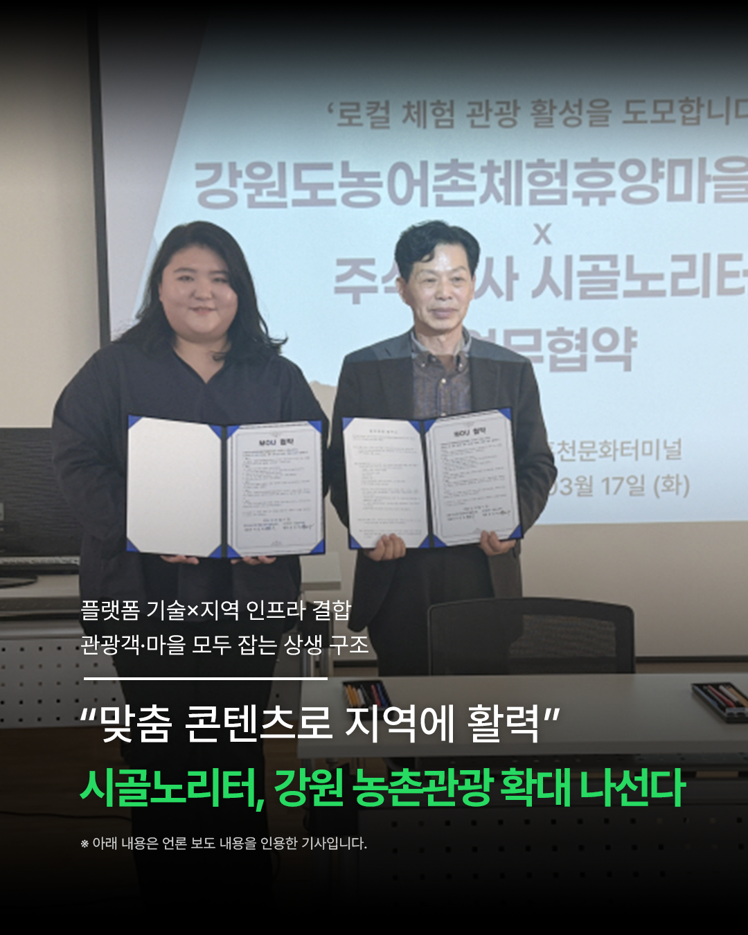 특히 이번 협력을 통해 강원의 자연과 지역 자원을 활용한 다양한 체험 프로그램이 더욱 확장될 예정이며, 관광객들은 보다 쉽고 직관적으로 농촌 여행을 즐길 수 있게 됩니다.
